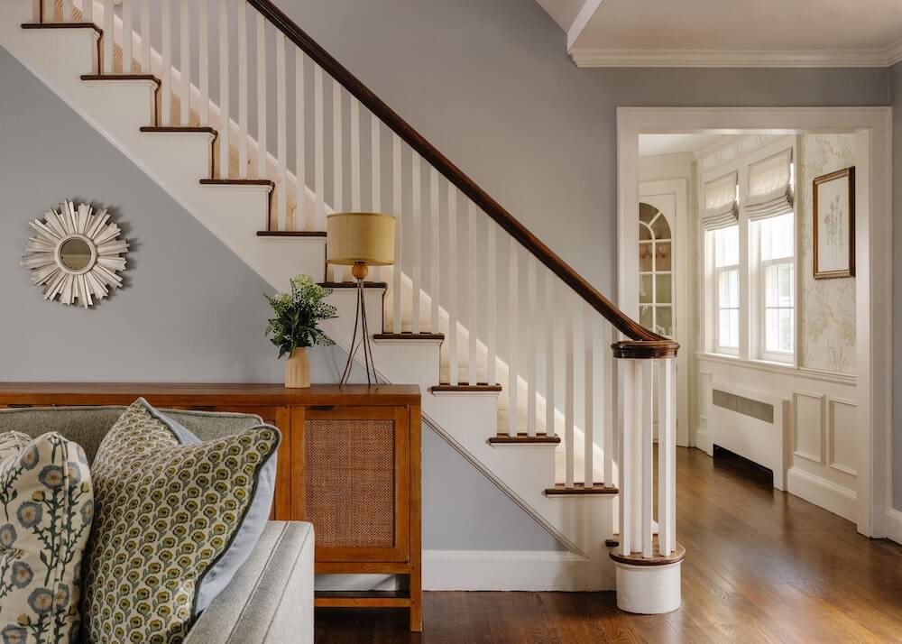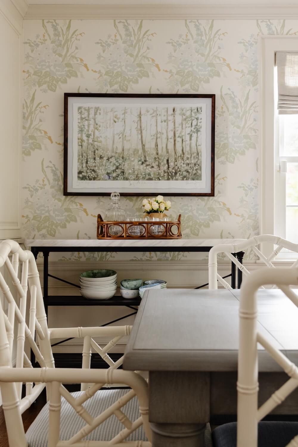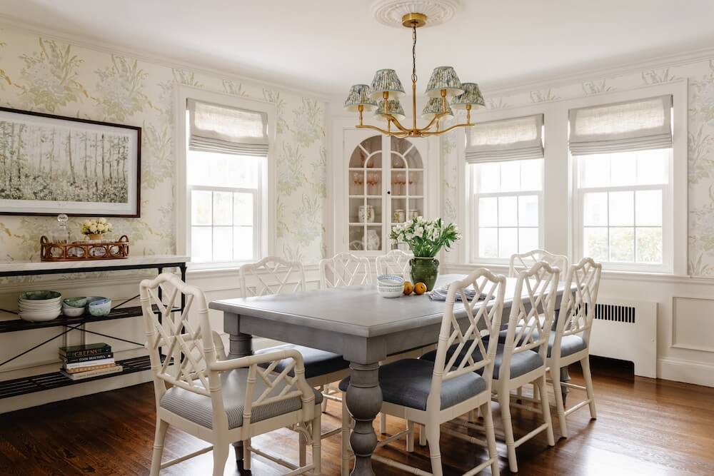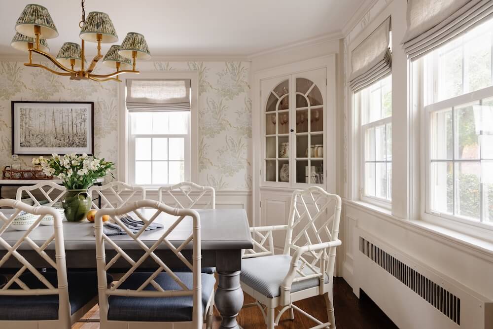 For our clients’ cozy New England home in Milton, we set out to make each space as livable and inviting as possible. When we began, the young family had only a few pieces from their first apartment in the South End, so this project was about creating a fresh start that felt both comfortable and full of personality. We furnished and designed the living and dining rooms with a mix of color, texture, and warmth, layering natural fibers with painted finishes. Custom wallpaper in the dining room and custom draperies in the living room add depth and detail.