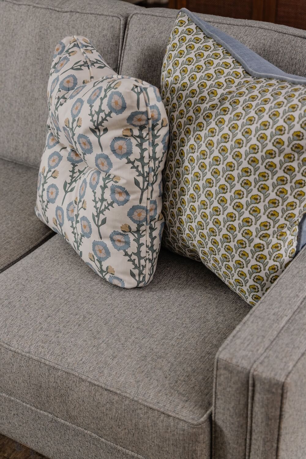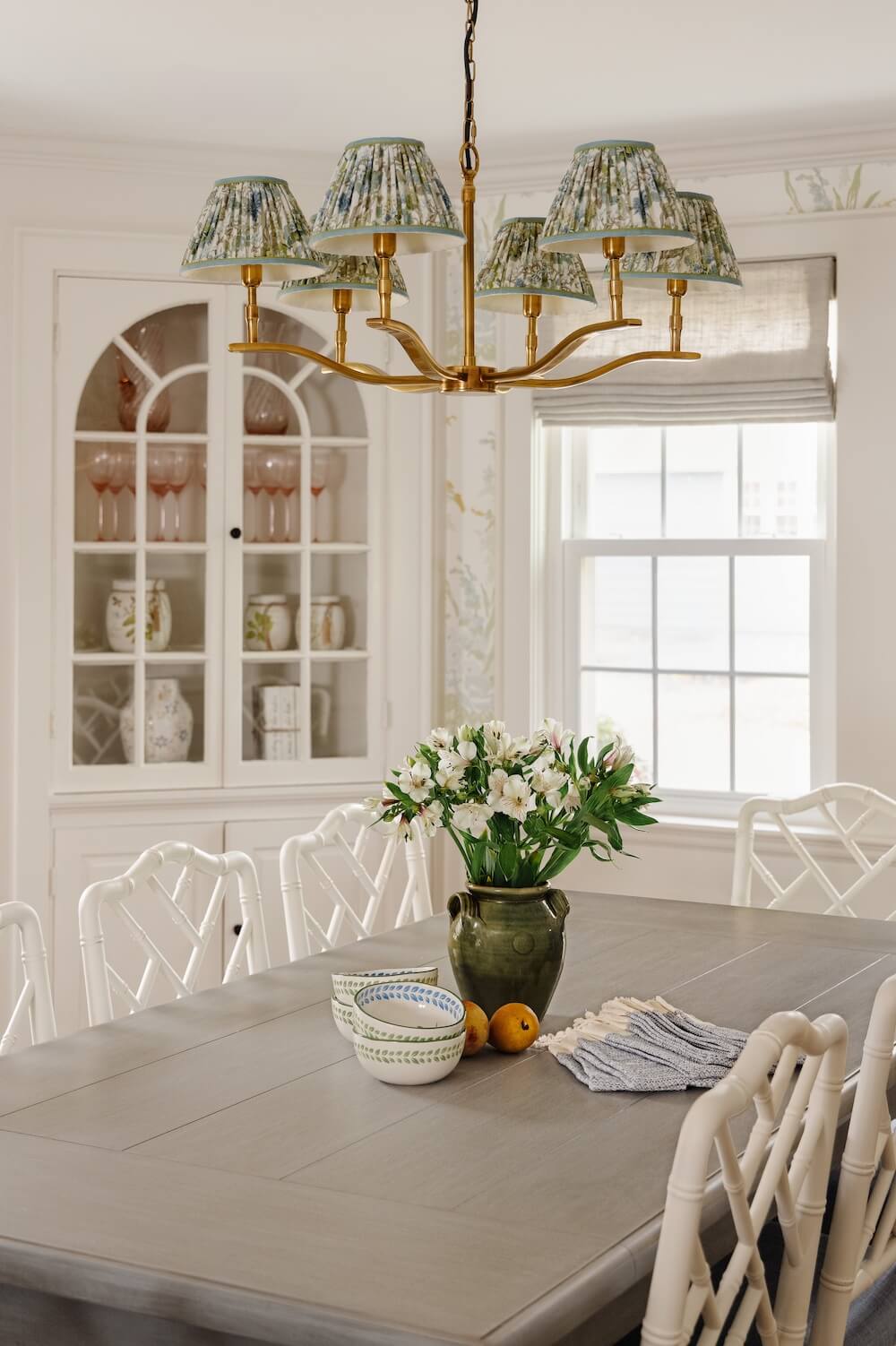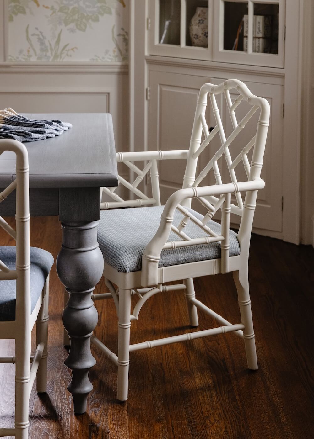 For our clients’ cozy New England home in Milton, we set out to make each space as livable and inviting as possible. When we began, the young family had only a few pieces from their first apartment in the South End, so this project was about creating a fresh start that felt both comfortable and full of personality. We furnished and designed the living and dining rooms with a mix of color, texture, and warmth, layering natural fibers with painted finishes. Custom wallpaper in the dining room and custom draperies in the living room add depth and detail.