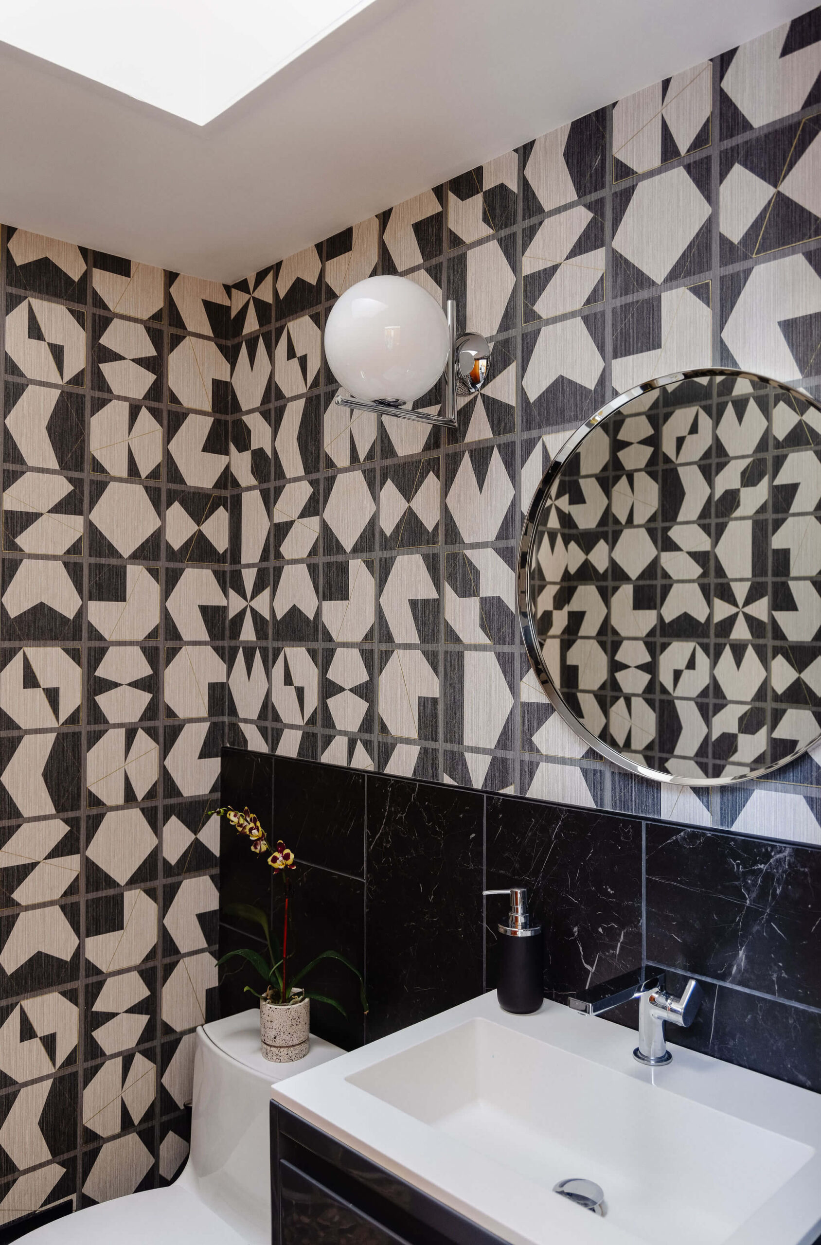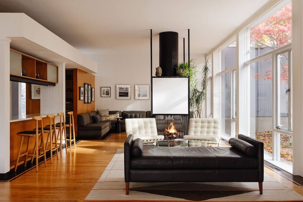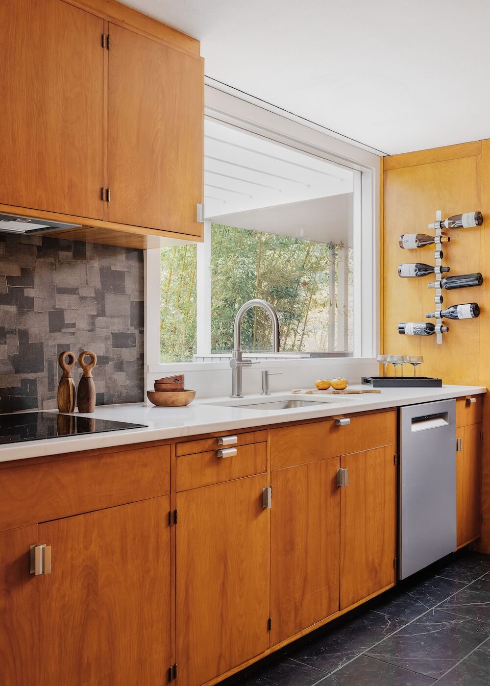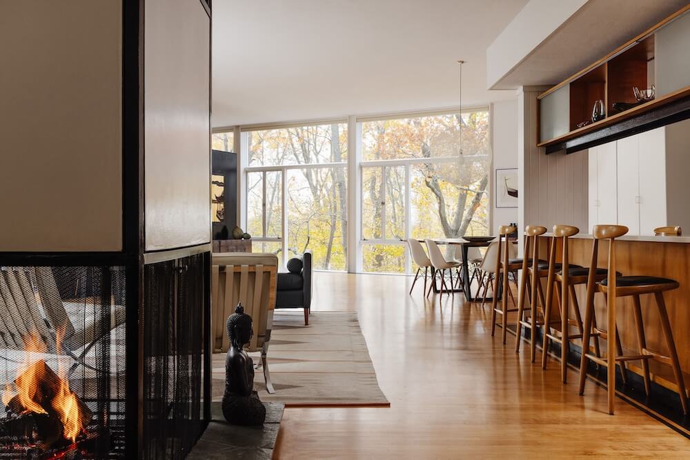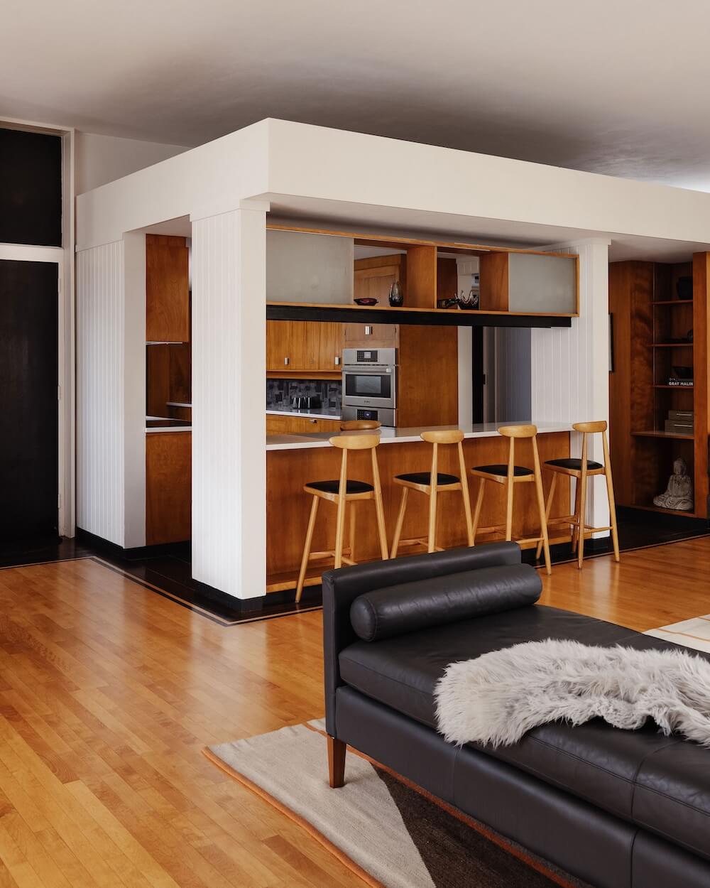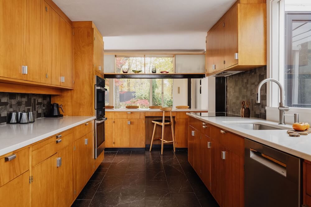 Aside from new hardwood floors and a few paint touch-ups, our clients’ home in Swampscott, MA—designed by mid-century modern architect Martin Bloom, a Walter Gropius-trained visionary—had remained virtually untouched. Passionate about preserving the original built-ins and modernist finishes, our clients wanted to maintain the home’s integrity while refreshing the service spaces, particularly the kitchen and bathrooms, which were in dire need of an update. Our design approach honored the home’s geometric architectural elements, including the distinctive kitchen enclosure and centrally located fireplace and chimney. We introduced new wallpaper, tile, and stone to complement the existing original wood cabinets and built-ins, resulting in a space that feels lighter, brighter, and more effortlessly modern—while also functioning seamlessly for a contemporary lifestyle.