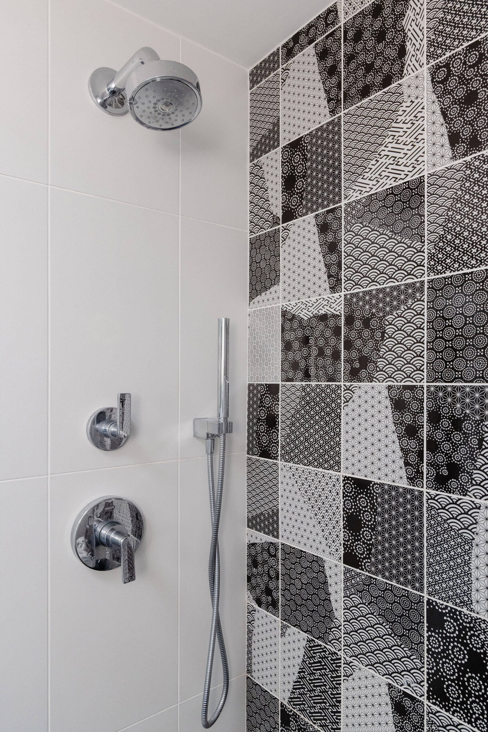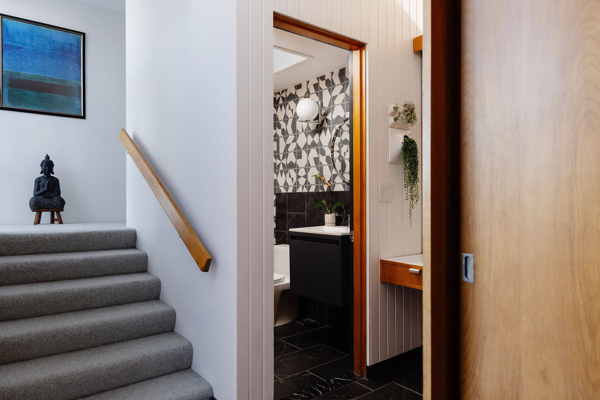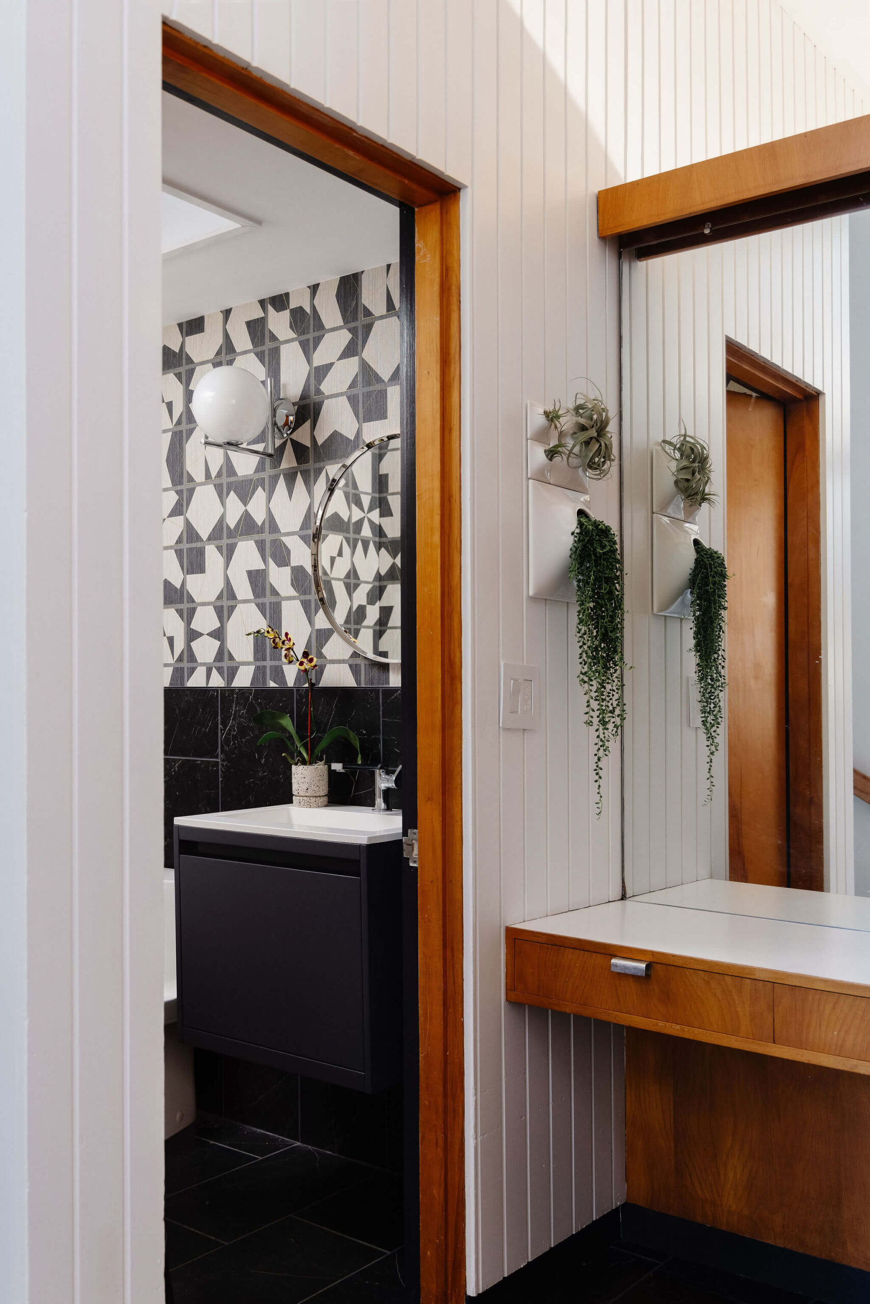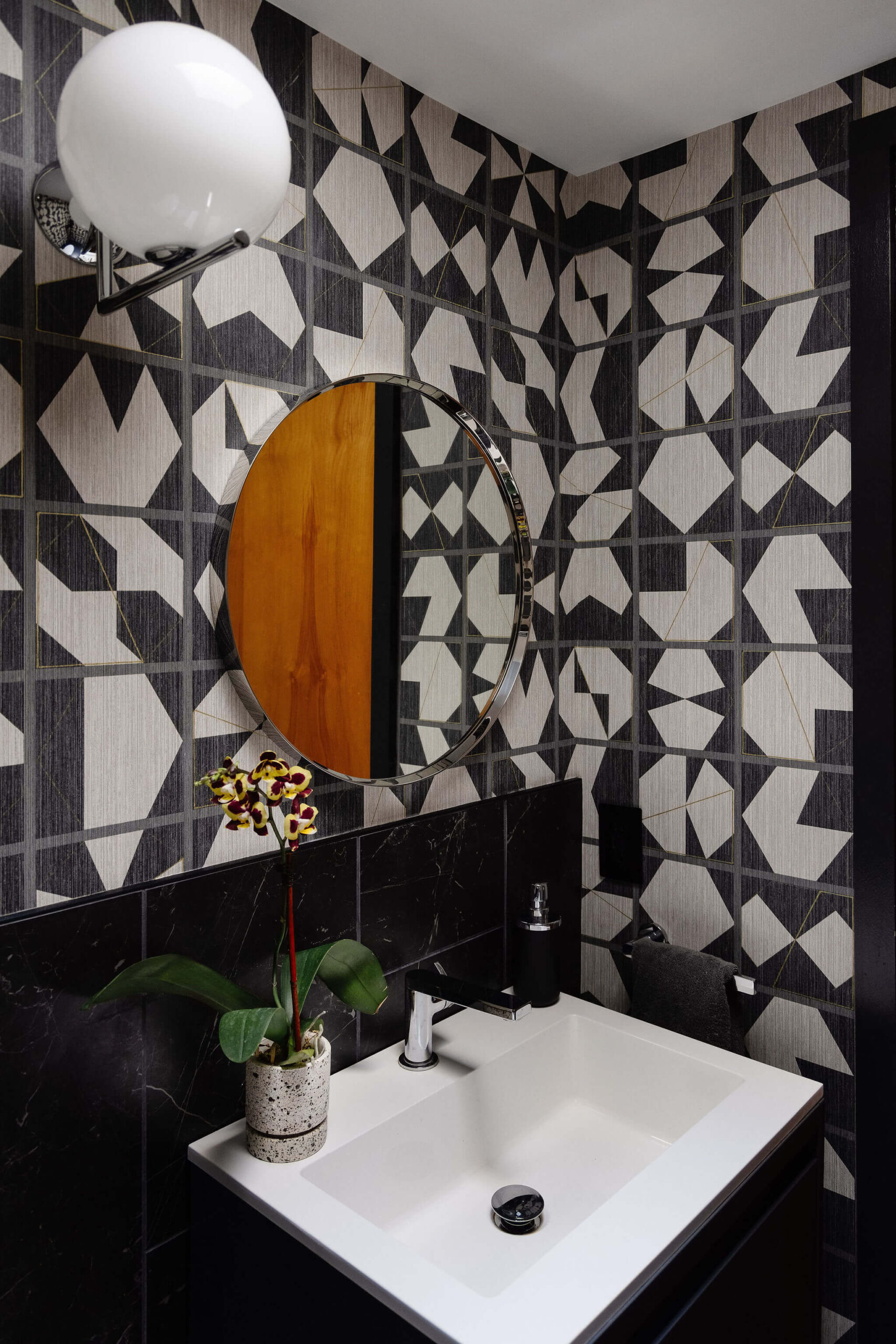 Aside from new hardwood floors and a few paint touch-ups, our clients’ home in Swampscott, MA—designed by mid-century modern architect Martin Bloom, a Walter Gropius-trained visionary—had remained virtually untouched. Passionate about preserving the original built-ins and modernist finishes, our clients wanted to maintain the home’s integrity while refreshing the service spaces, particularly the kitchen and bathrooms, which were in dire need of an update. Our design approach honored the home’s geometric architectural elements, including the distinctive kitchen enclosure and centrally located fireplace and chimney. We introduced new wallpaper, tile, and stone to complement the existing original wood cabinets and built-ins, resulting in a space that feels lighter, brighter, and more effortlessly modern—while also functioning seamlessly for a contemporary lifestyle.
