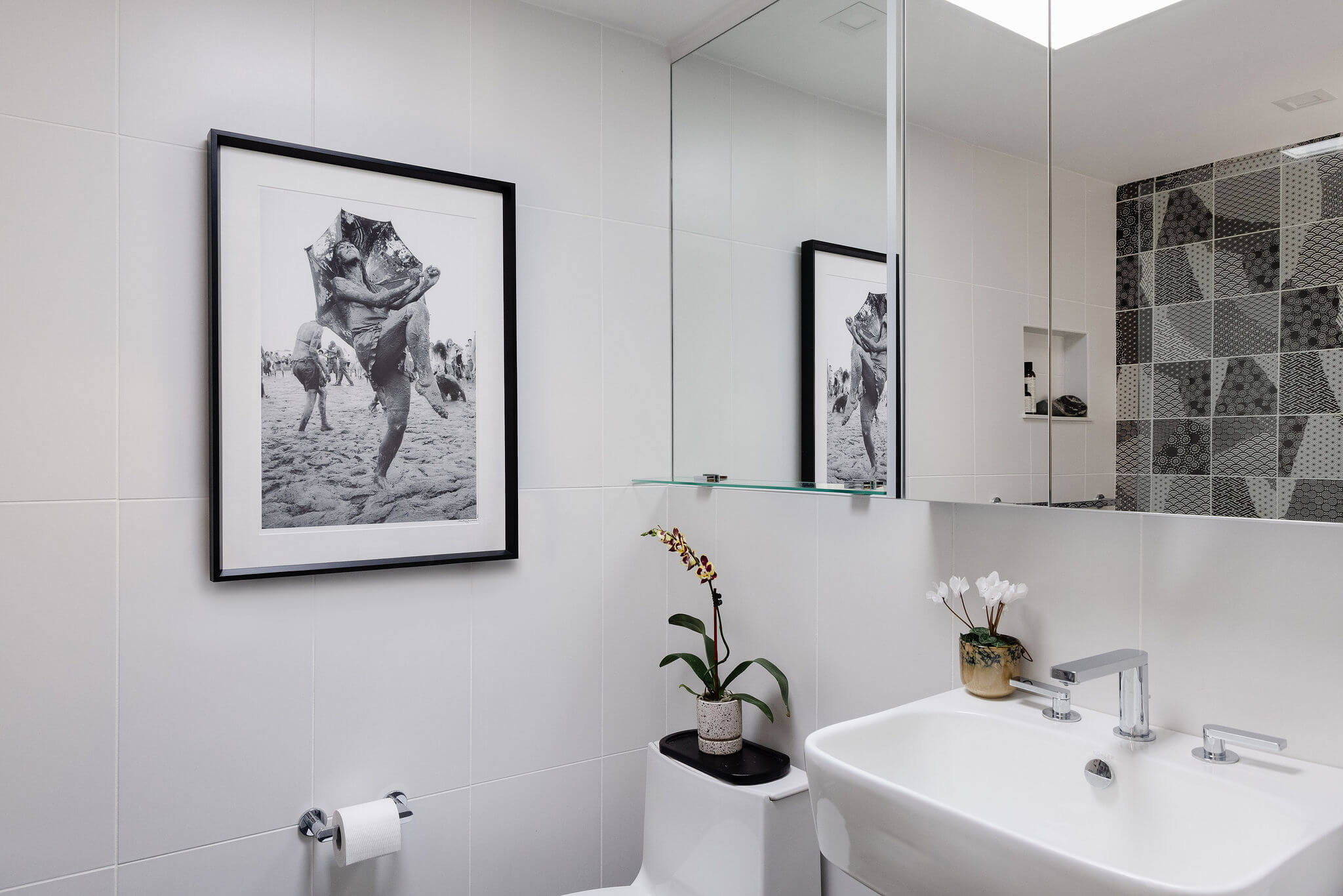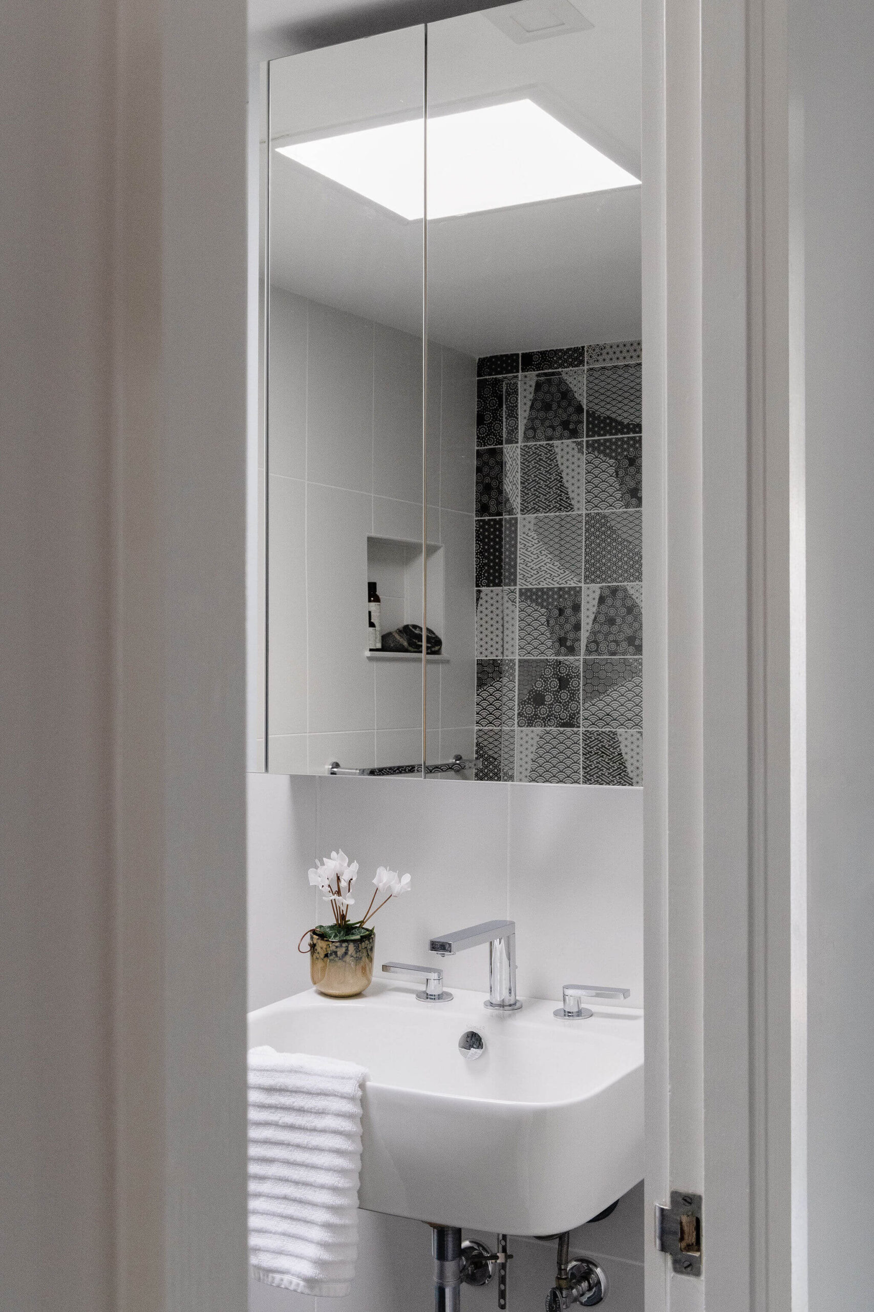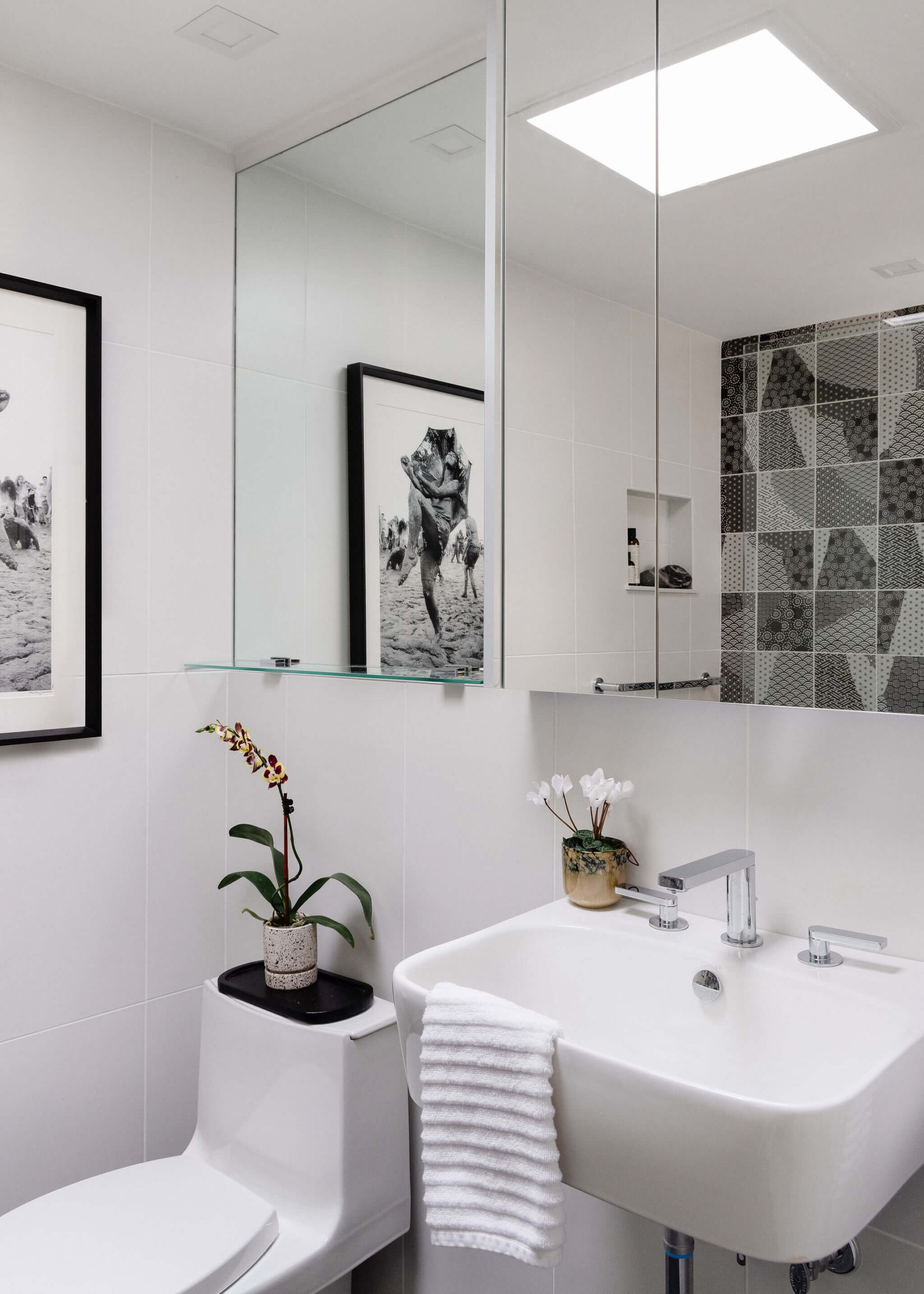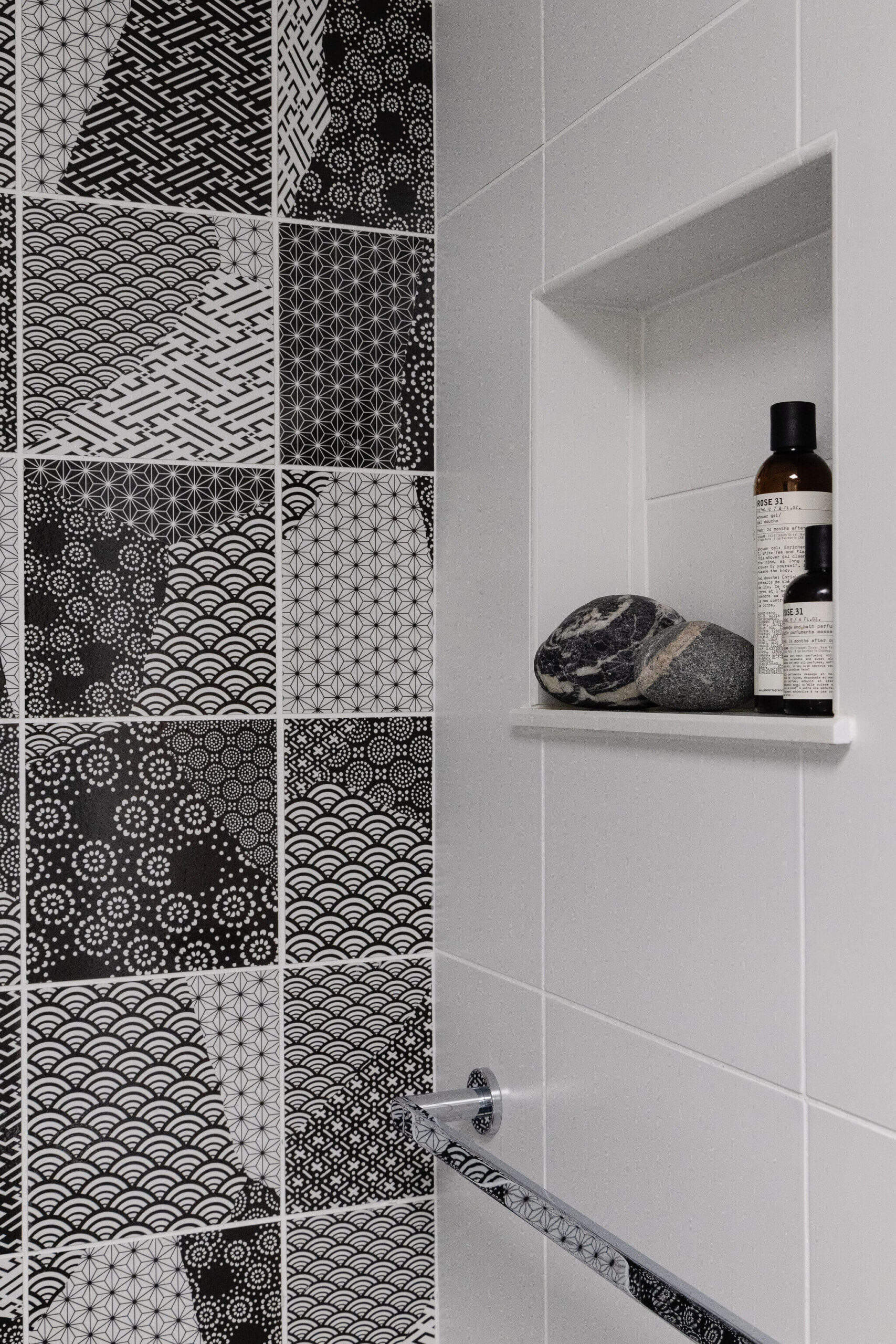 Aside from new hardwood floors and a few paint touch-ups, our clients’ home in Swampscott, MA—designed by mid-century modern architect Martin Bloom, a Walter Gropius-trained visionary—had remained virtually untouched. Passionate about preserving the original built-ins and modernist finishes, our clients wanted to maintain the home’s integrity while refreshing the service spaces, particularly the kitchen and bathrooms, which were in dire need of an update. Our design approach honored the home’s geometric architectural elements, including the distinctive kitchen enclosure and centrally located fireplace and chimney. We introduced new wallpaper, tile, and stone to complement the existing original wood cabinets and built-ins, resulting in a space that feels lighter, brighter, and more effortlessly modern—while also functioning seamlessly for a contemporary lifestyle.