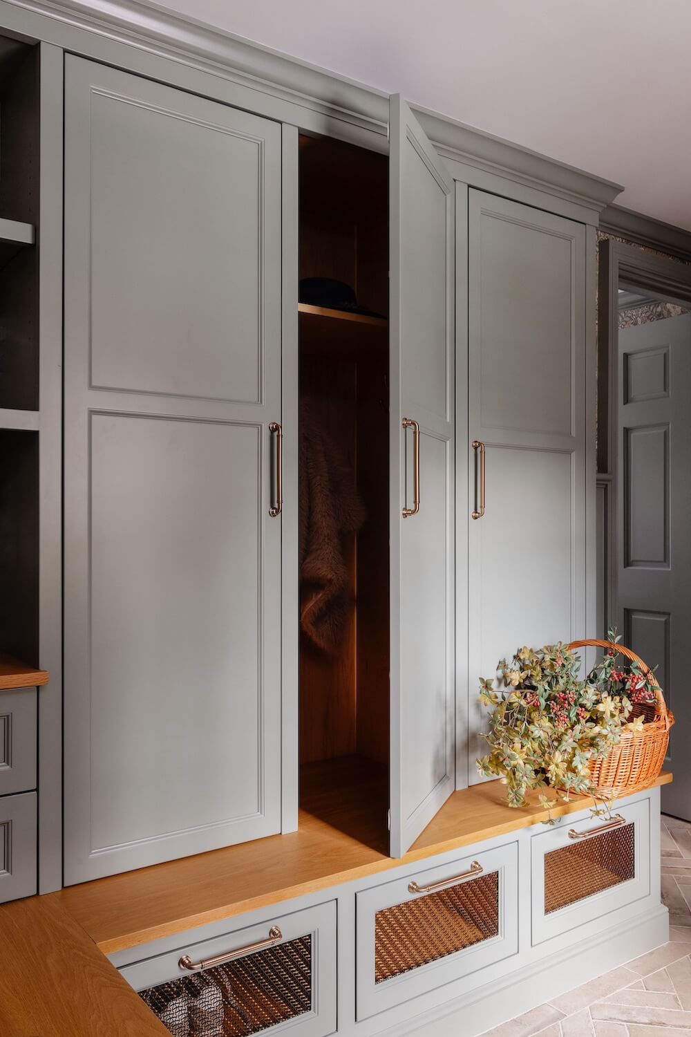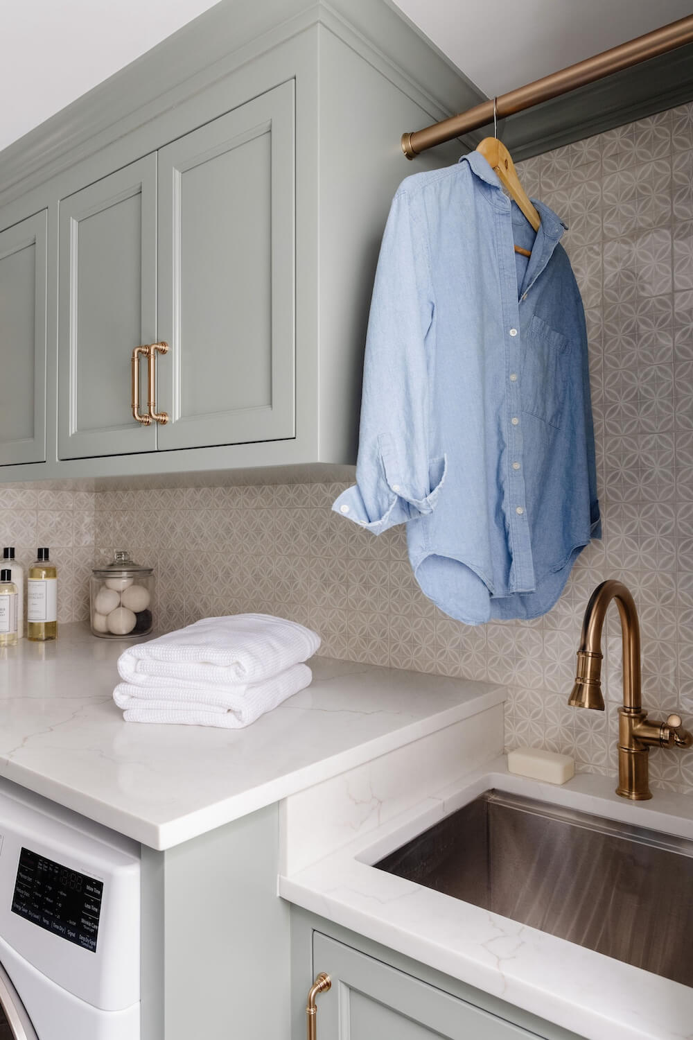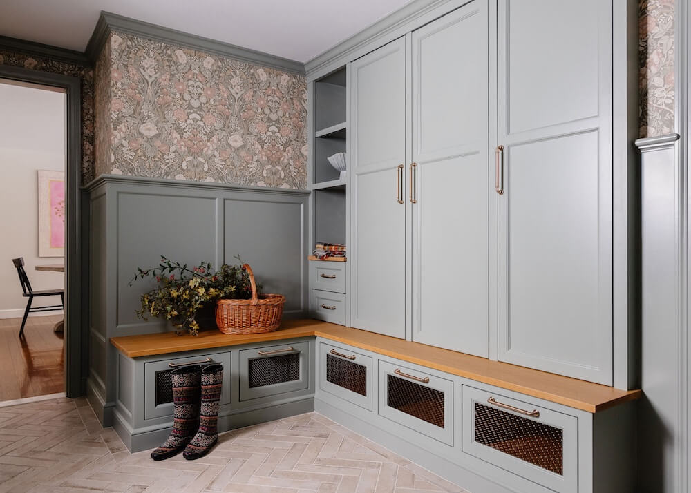 For our clients’ home on Squirrel Hill Road in Wayland, MA, we transformed key functional areas to better suit their busy family of five. Located in a beautiful, wooded neighborhood, this forever home needed spaces that were as practical as they were elegant. We expanded and redesigned the mudroom and laundry room to improve flow, organization, and everyday functionality. Custom cabinetry, clever storage solutions, and statement wallpaper bring warmth and character to these hardworking spaces.