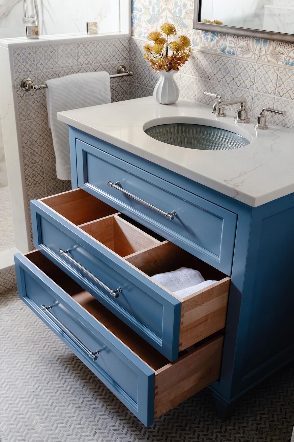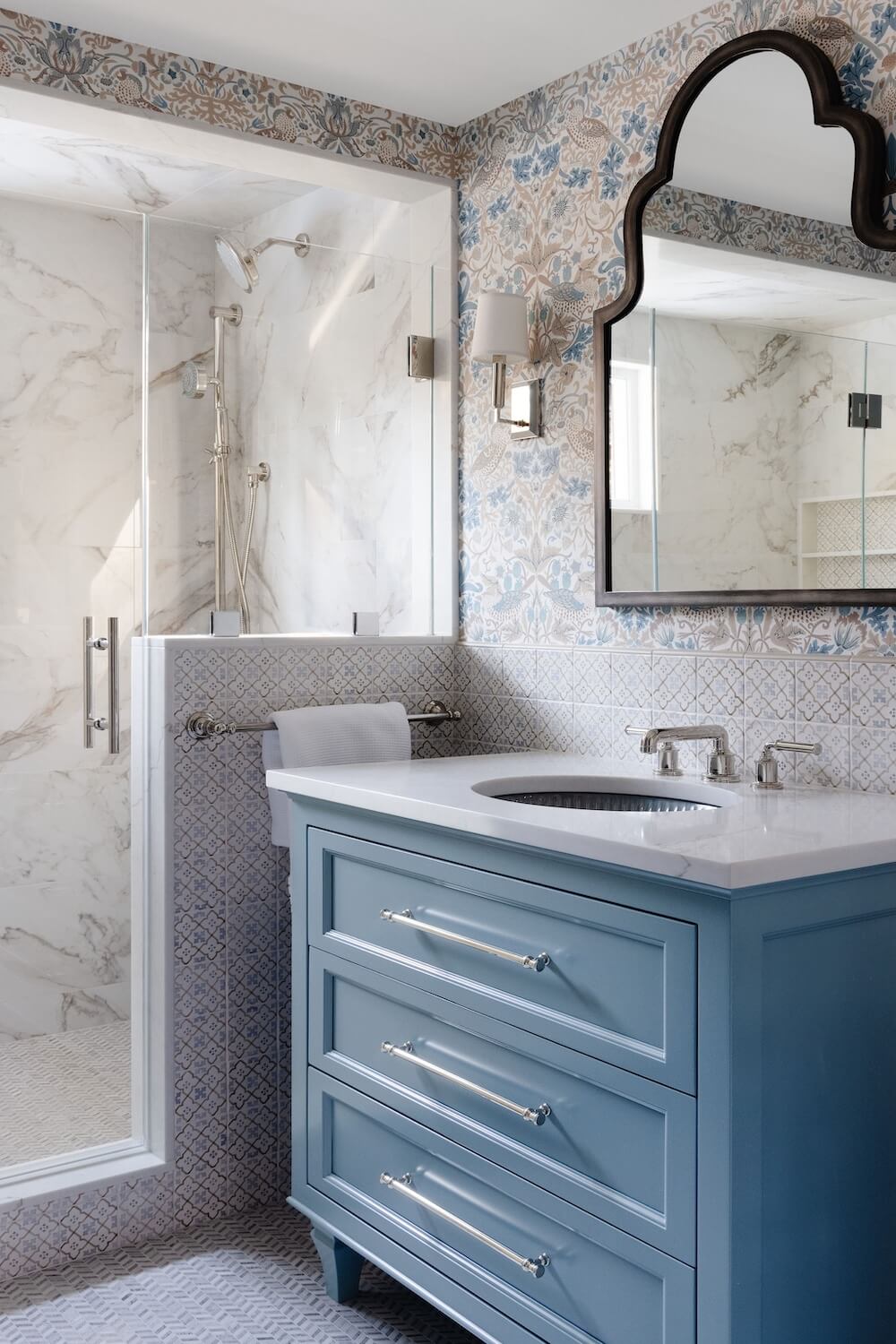 The first-floor bathroom, the home’s main bath, was also enlarged and completely reimagined. A mix of porcelain tile and marble mosaic adds texture and sophistication, while a handmade artisan sink serves as a stunning focal point. The finished result is a home that feels thoughtful, welcoming, and built to last: beautifully balancing family life with timeless design.