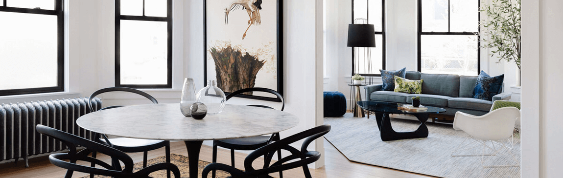 Historic meets contemporary in this three-floor home in Watertown, MA. The basement reveals fascinating traces of the building’s past, including outlines of an old dental office and a graffiti-covered wall by a famous artist who once lived there. Our art-collecting clients desired a relaxing, modern interior that preserved the house’s original bones, so we created an airy, gallery-like space with eclectic, international art pieces, crisp white walls, and modern furnishings. The design seamlessly blends contemporary elements, like colorful tiles, mid-century modern-influenced furnishings, walnut-interior kitchen cabinets, along with restored elements such as the original radiators resulting in a vibrant, yet sophisticated aesthetic.